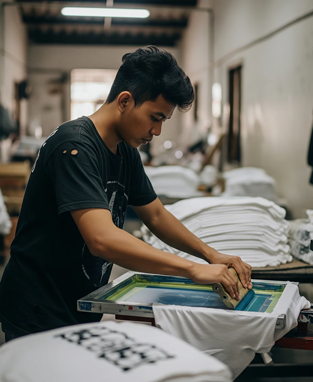 The process involves applying printing ink through a screen to create custom designs on fabric with precision and quality.